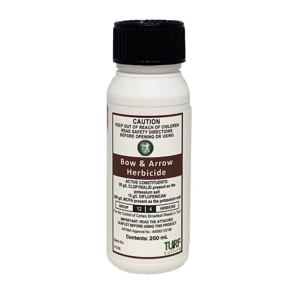 Bow & Arrow Herbicide for broadleaf weed control in turf is a formulation containing the active ingredients, MCPA as potassium salt, clopyralid as potassium salt and diflufenican. It is used at an application rate of 5 litres per hectare.